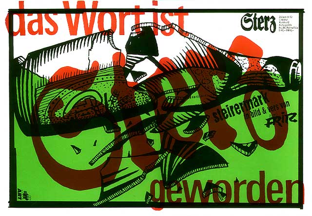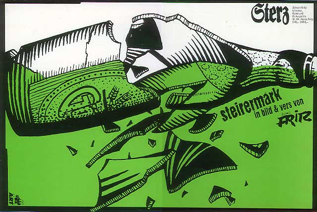 Sterz 44: Herms Fritz: steirermark in bild & vers Herausgeber: Gerald Brettschuh, Klaus Kada, Heinz Musker, Dieter Schoeller, Herbert Schweiger-Nichols, Heimo Steps, Peter Strasser, Gerd Tiefner, Heribert Watzke. Redaktion: Gernot Lauffer, Ludwig Frege. Gastredakteur für dieses Heft: Heimo Steps. Gestaltung: Herms Fritz. Produktion der beigelegten Single: Heinz Musker. Druck: Vavra, Graz. Herms Fritz: Umschlagsgrafik Gernot Lauffer: Zu diesem Heft. Herms Fritz: Texte und Grafiken mit dem Titel: kopfübaloch. märz aprül. beispül. da frevler. o held. da dokta is weit. so oana. wias oan gehn kann. in da kuchl. dahoam. da hirsch. puziwuzi. im winta. nix für mi. di krah. er & sie. dei schattn. glogn. feiaabnd. a neuche hosn. ratschlag. wann oana hamkummb. was guats. dea woaß scho wiaso. haltaus. Wolfram Orthacker: Foto zur Biografie. |